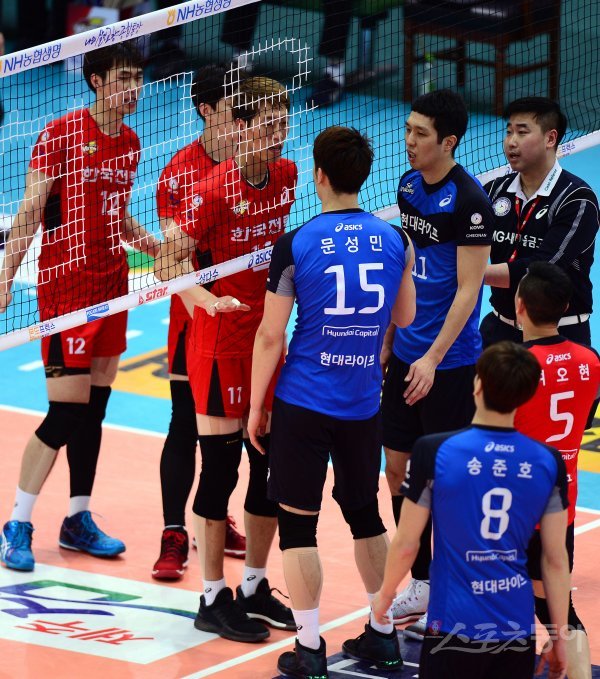 21일 수원실내체육관에서 ‘2016-2017 NH농협 V리그’ 수원 한국전력과 천안 현대캐피탈의 플레이오프 2차전 경기가 열렸다. 현대캐피탈 문성민과 한국전력 윤봉우가 신경전을 벌이고 있다.