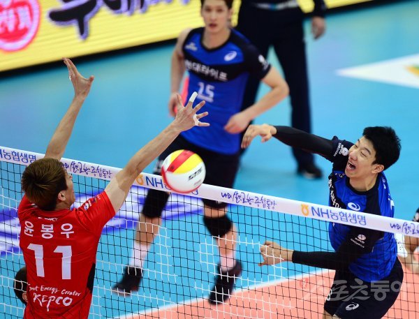 21일 수원실내체육관에서 ‘2016-2017 NH농협 V리그’ 수원 한국전력과 천안 현대캐피탈의 플레이오프 2차전 경기가 열렸다. 현대캐피탈 신영석이 한국전력 블로커를 피해 공격을 펼치고 있다.