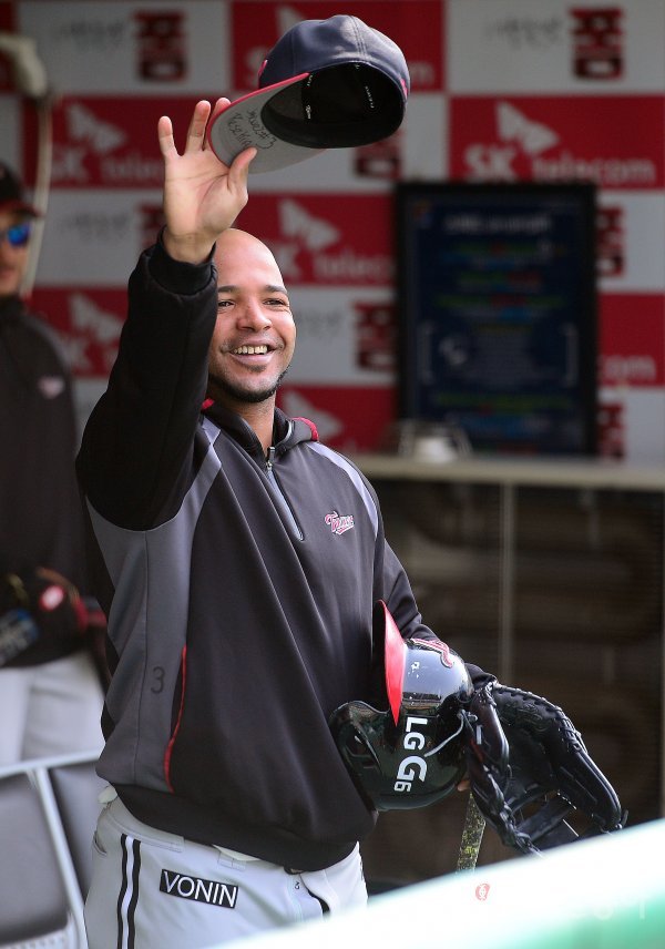 23일 인천 SK행복드림구장에서 ‘2017 타이어뱅크 KBO리그’ 시범경기 SK와이번스와 LG트윈스의 경기가 열린다. 경기를 앞두고 LG 히메네스가 SK 선수들을 향해 손을 흔들고 있다.