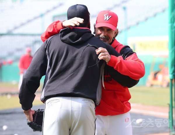 23일 인천 SK행복드림구장에서 ‘2017 타이어뱅크 KBO리그’ 시범경기 SK와이번스와 LG트윈스의 경기가 열린다. 경기를 앞두고 SK 힐만 감독이 LG 소사(왼쪽)와 포옹을 하고 있다.