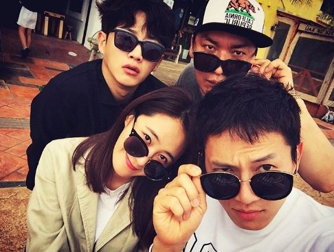 사진 속에는 소녀시대 유리, 지성, 그리고 조재윤이 함께 선글라스를 끼고 카메라를 향해 장난스런 표정을 짓고 있다.