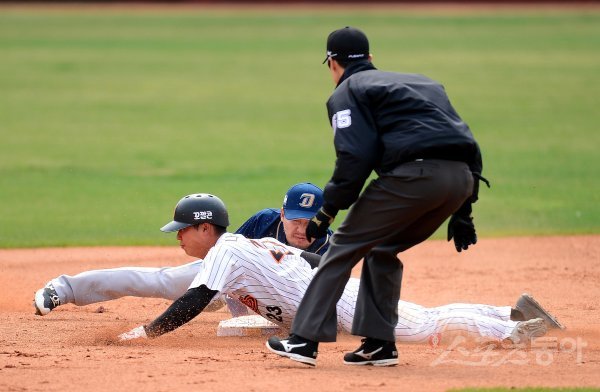 23일 부산 사직야구장에서 ‘2017 타이어뱅크 KBO 리그’ NC다이노스와 롯데자이언츠 시범경기가 열렸다. 1회말 무사 롯데 이우민 외야플라이 아웃 때 1루주자 나경민이 언더베이스 시도해 2루에서 세이프 되고 있다.