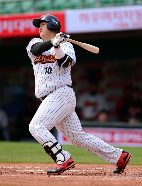 23일 부산 사직야구장에서 ‘2017 타이어뱅크 KBO 리그’ NC다이노스와 롯데자이언츠 시범경기가 열렸다. 1회말 2사 3루 롯데 이대호가 동점 적시타를 치고 있다.