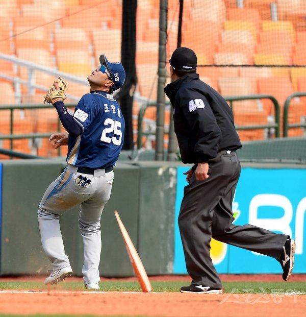 23일 부산 사직야구장에서 ‘2017 타이어뱅크 KBO 리그’ NC다이노스와 롯데자이언츠 시범경기가 열렸다. 4회말 NC 조평호가 롯데 신본기. 파울볼을 잡으려는 사이 부러진 배트로 날아오고 있다.