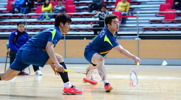 24일 경남 밀양배드민턴경기장에서 열린 ‘2017 전국봄철종별배드민턴리그전’ 남자일반부 단체전 결승 복식에서 정재욱-김기정(오른쪽) 조가 스매싱 공격을 하고 있다.