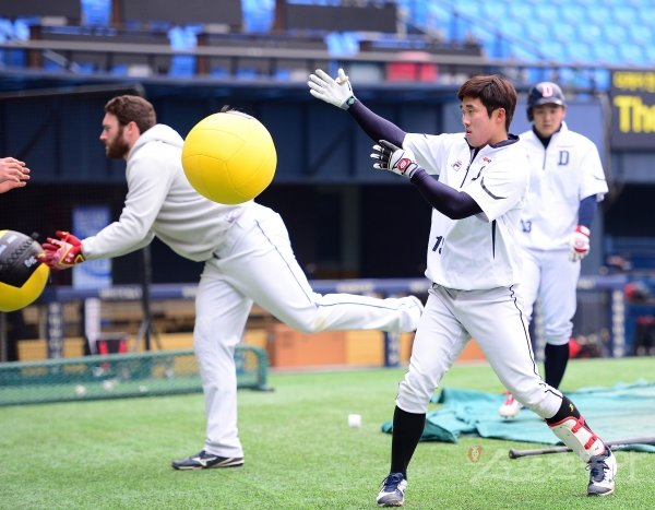 25일 잠실야구장에서 ‘2017 타이어뱅크 KBO리그’ 시범경기 두산베어스와 LG트윈스의 경기가 열린다. 경기를 앞두고 두산 허경민이 짐볼을 이용해 훈련을 하고 있다.