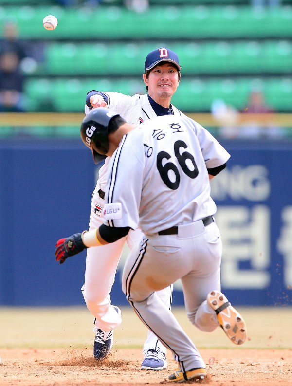 25일 잠실야구장에서 ‘2017 타이어뱅크 KBO리그’ 시범경기 두산베어스와 LG트윈스의 경기가 열렸다. 3회초 1사 1루에서 두산 유격수 김재호가 LG 김용의의 땅볼 때 2루로 향하는 강승호를 포스아웃 시킨 후 1루로 송구하고 있다.