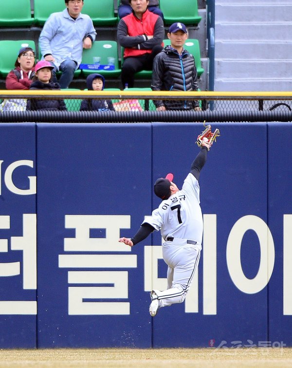 25일 잠실야구장에서 ‘2017 타이어뱅크 KBO리그’ 시범경기 두산베어스와 LG트윈스의 경기가 열렸다. 4회말 1사 1,2루에서 LG 이병규가 두산 오재원의 좌익수 방면 깊숙한 타구를 잡아내고 있다.