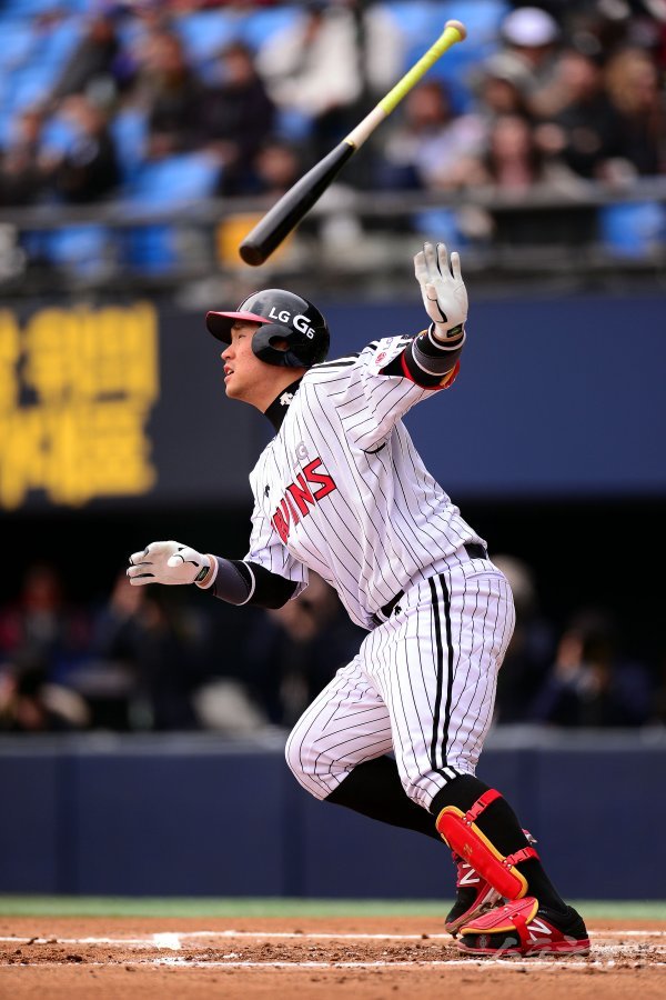 26일 서울 잠실야구장에서 ‘2017 타이어뱅크 KBO 리그’ 두산베어스와 LG트윈스 시범경기가 열렸다. 2회말 1사 1루 LG 유강남이 선제 1타점 중전 2루타를 치고 있다. 잠실 | 김종원기자 won@donga.com