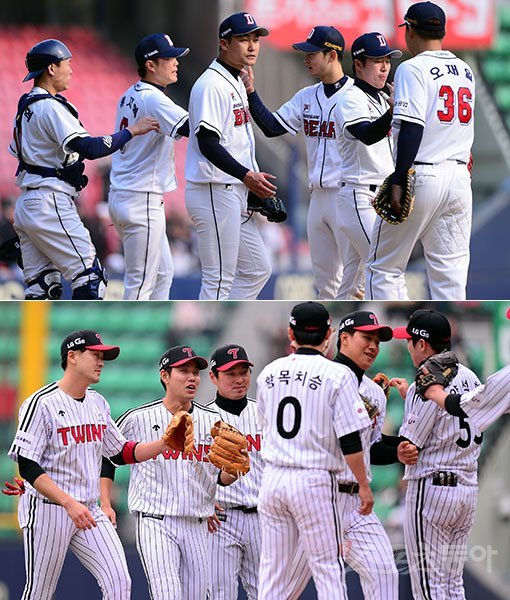 25일 잠실야구장에서 열린 ‘2017 타이어뱅크 KBO리그’ 시범경기 두산베어스와 LG트윈스의 경기에서 두산이 2-1로 승리했다. 경기 후 두산 선수들이 기쁨을 나누고 있다. (위) 26일 서울 잠실야구장에서 ‘2017 타이어뱅크 KBO 리그’ 두산베어스와 LG트윈스 시범경기가 열렸다. 5-4 승리를 거둔 후 LG 선수들이 기뻐하고 있다. (아래). 스포츠동아DB