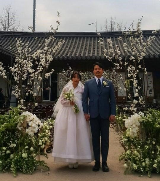 공개된 사진 속 윤우현은 수트를 차려 입고 늠름하게 서 있으며, 최진이는 하얀색 한복 드레스를 입고 부케를 들고 있다.