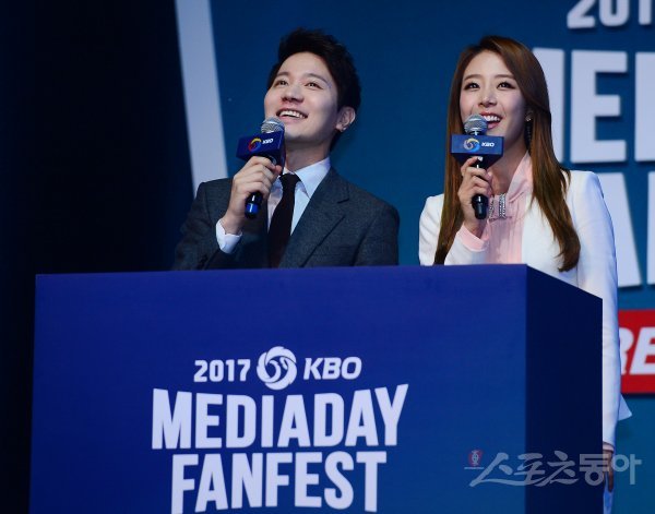 27일 서울 용산구 블루스퀘어 삼성카드홀에서 ‘2017 타이어뱅크 KBO 미디어데이 & 팬페스트’가 열렸다. MBC 김정근 아나운서와 MBC Sports+ 배지현 아나운서가 진행을 하고 있다.