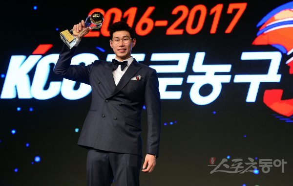 27일 서울 용산구 그랜드하얏트호텔에서 열린 ‘2016-2017 KCC 프로농구 시상식’에서 MVP를 수상한 오세근(KGC인삼공사)가 카메라를 향해 포즈를 취하고 있다.