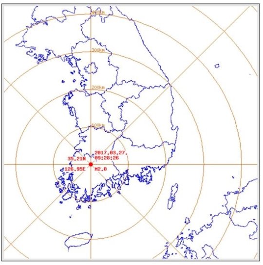 기상청은 27일 오전 9시 28분쯤 광주 북구 북동쪽 5㎞ 지역에서 규모 2.0 지진이 발생했다고 밝혔다. 진앙은 북위 35.21도, 동경 126.95도 지점이다.