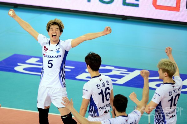 27일 인천 계양체육관에서 ‘2016-2017 NH농협 V리그’ 인천 대한항공과 천안 현대캐피탈의 챔피언결정전 2차전 경기가 열렸다. 대한항공 최석기가 서브득점을 성공시킨 뒤 포효하고 있다.