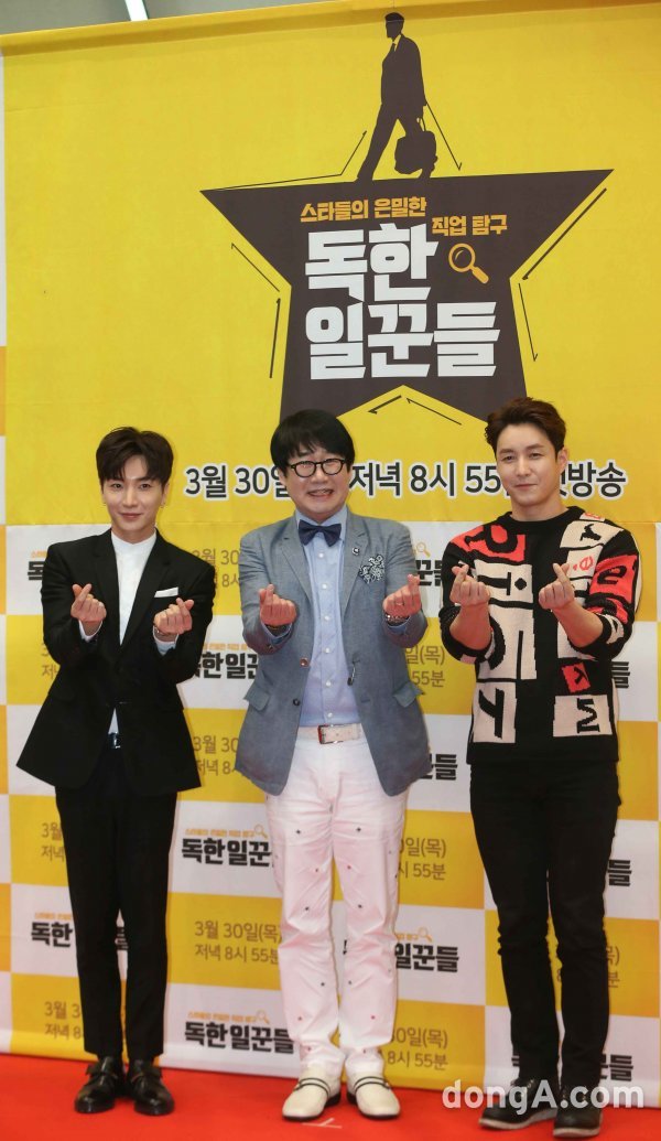 가수 이특, 개그맨 최양락, 배우 심형탁이 28일 오후 서울 여의도 KBS에서 열린 예능 프로그램 독한 일꾼들 제작발표회에 참석해 포토타임을 하고 있다.