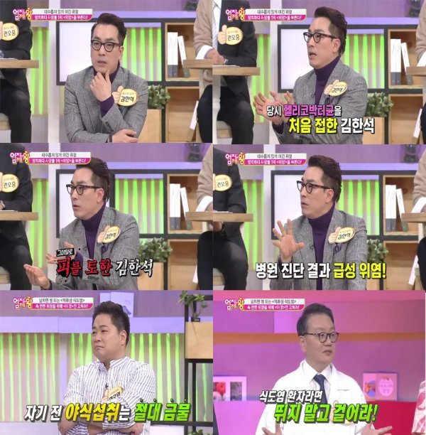 이날 방송에 출연한 코미디언 김한석은 위장 자가진단을 하던 중, "명치가 쓰려서 잠도 잘 못 자고 피까지 토한 적이 있다"는 깜짝 고백으로 충격을 안겼다. 이어 "평소 명치가 쓰려서 새벽마다 잠을 못 이룬다”면서 “그러다 보니 다음날 눈이 붓고 헛배가 부르면서 배에 가스가 잘 찬다. 자가진단 항목 중 대부분의 안 좋은 증상에 해당된다”고 털어놨다. 또 김한석은 "컨디션이 좀 안 좋은 날에는 기침을 할 때 피가 섞여 나오더니, 그게 심해지자 말 그대로 피를 토한 적이 있다. 급히 병원을 찾았더니, 급성 위염 진단을 받았다”고 덧붙이며 프로젝트에 적극적으로 동참하겠다는 각오를 밝혔다.
