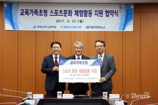 프로야구 NC 다이노스가 경상남도교육청(교육감 박종훈), NH농협은행 경남본부(본부장 김석균)와 27일 도교육청에서 소규모학교 교육가족(학부모, 학생, 교사)이 함께하는 스포츠문화 체험활동 지원을 약속하는 행사를 열었다.