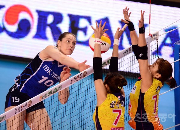 28일 경기도 화성실내체육관에서 ‘2016-2017 NH농협 V리그’ 화성 IBK기업은행과 인천 흥국생명의 챔피언결정전 3차전 경기가 열렸다. IBK기업은행 리쉘이 흥국생명 블로커를 피해 스파이크를 날리고 있다.