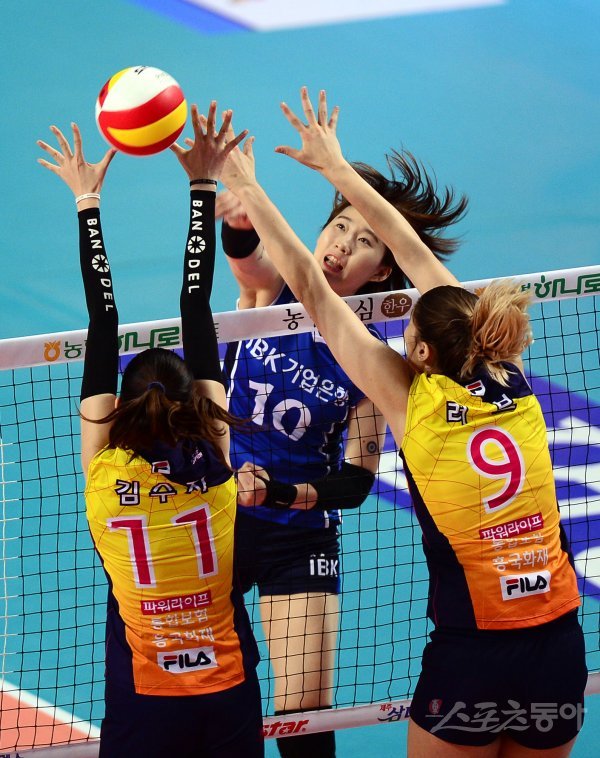 28일 경기도 화성실내체육관에서 ‘2016-2017 NH농협 V리그’ 화성 IBK기업은행과 인천 흥국생명의 챔피언결정전 3차전 경기가 열렸다. IBK기업은행 박정아가 흥국생명 블로커를 피해 스파이크를 날리고 있다.