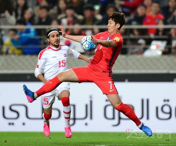 한국 축구대표팀이 28일 서울월드컵경기장에서 시리아와 2018 러시아 월드컵 아시아지역 최종예선 7차전을 가졌다. 한국 손흥민이 가슴 트래핑으로 패스를 받고 있다.