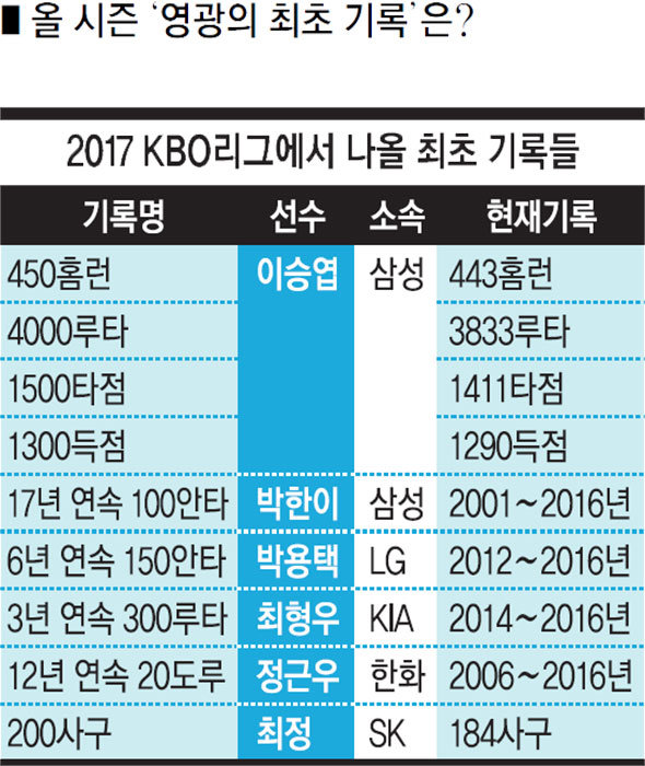 2017 KBO 정규시즌 개막이 이틀 앞으로 다가왔다. 올 시즌은 프리에이전트(FA)를 통한 이적과 사령탑의 이동, 순수 신인들의 활약 등 다양한 볼거리를 제공할 전망이다. 대기록의 향연도 팬들의 관심을 끌만한 요소다. 올 시즌 KBO리그에서 나올 사상 첫 대기록은 무엇일까.
