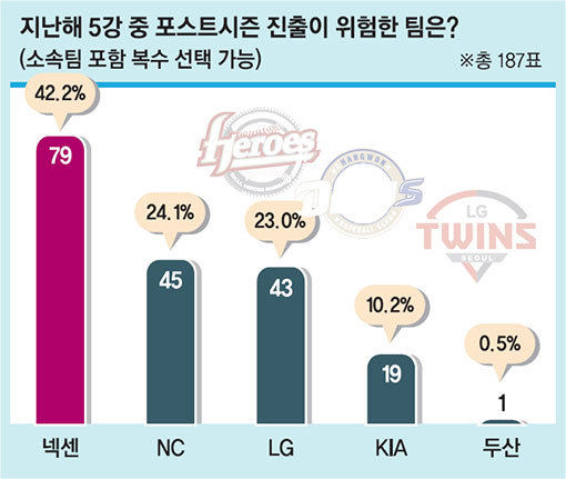 설문조사를 하다보면 대부분 지난해 기록을 토대로 비슷한 대답이 나온다. 그래서 아예 지난해 가을야구를 경험한 5팀 중에 올 시즌 포스트시즌 진출이 위험한 팀을 꼽아달라고 부탁했다. 소속팀을 포함해 복수 선택이 가능하도록 했다. 100명 중에 13명은 1팀만 꼽고, 87명은 2팀씩을 선택했다. 총 184표가 집계된 가운데, 넥센이 79표를 받아 가장 위험한 팀으로 꼽혔다. 전체 응답 중 42.2%에 해당하는 비율이다. 넥센은 염경엽 감독에서 초보 사령탑 장정석 감독으로 바뀌었고, 코칭스태프도 대거 교체됐다.