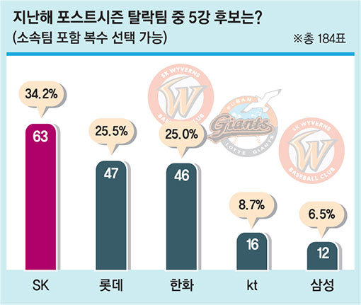 그렇다면 지난해 포스트시즌 탈락팀 중 올해 5강에 들어갈 가장 강력한 후보는 어디일까. 선수들은 SK를 주목했다. 총 184표(소속팀 포함 복수선택 가능)가 나온 가운데 트레이 힐만 감독을 새로 영입한 SK가 63표(34.2%)를 얻었다. 이어 이대호의 복귀로 기대감을 높인 롯데가 47표(25.5%)를 획득했다. 한화는 롯데보다 1표 뒤진 46표(25%). 1군 리그 진입 후 2년 연속 최하위를 차지한 kt가 16표(8.7%)를 받았다. 삼성은 소속팀 선수들의 적극적인 투표에도 불구하고 총 12표(6.5%)만 얻어 다른 팀 선수들 사이에서 올 시즌 5강 진입 가능성이 가장 낮은 팀으로 평가됐다.