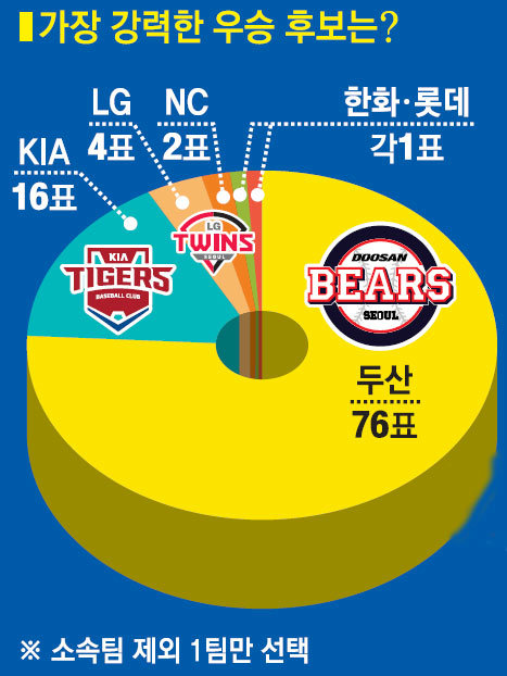 그 결과 두산이 총 76표를 받아 1위에 올랐다. 100명에게 1팀씩만 답변을 받았기 때문에 76%가 두산을 선택했다고 볼 수 있다. 그러나 실제로는 두산 선수 10명은 두산을 아예 선택지에서 제외할 수밖에 없었기 때문에 90명 중에 76표를 얻었다고 볼 수 있다. 다시 말해 다른 9개구단 선수들만 놓고 보면 84.4%의 압도적 지지율이다. 두산에 이어 FA(프리에이전트) 시장에서 최형우를 영입한 KIA가 두산의 우승을 저지할 가장 강력한 대항마로 지목되고 있다. KIA는 총 16표를 얻었다.