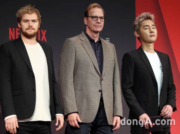배우 핀 존스, 감독 스콧 벅, 방송인 허지웅(왼쪽부터) 29일 오전 서울 광화문 포시즌스호텔 그랜드볼룸에서 열린 외화 마블 아이언 피스트 기자 간담회에 참석해 포토타임을 하고 있다.