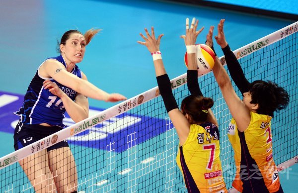 30일 경기도 화성실내체육관에서 ‘2016-2017 NH농협 V리그’ 화성 IBK기업은행과 인천 흥국생명의 챔피언결정전 4차전 경기가 열렸다. IBK기업은행 리쉘이 흥국생명 블로커를 피해 스파이크를 날리고 있다.