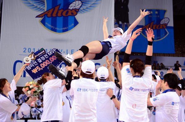 30일 경기도 화성실내체육관에서 ‘2016-2017 NH농협 V리그’ 화성 IBK기업은행과 인천 흥국생명의 챔피언결정전 4차전 경기가 열렸다. IBK기업은행이 흥국생명을 꺾고 챔피언 우승을 차지한 뒤 MVP를 수상한 리쉘이 헹가래를 받고 있다.