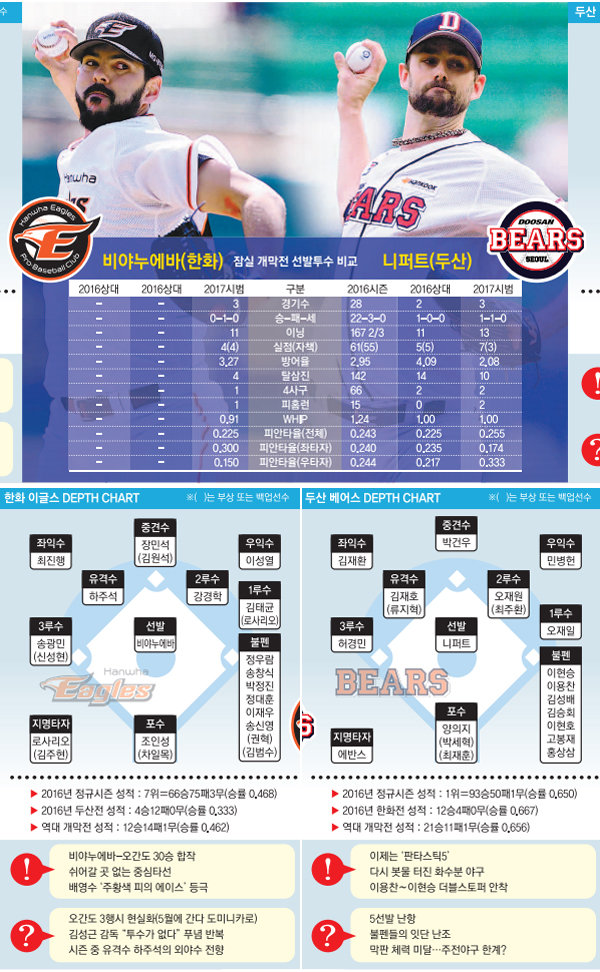 선발 매치업부터 뜨겁다. 두산은 ‘개막전의 사나이’ 니퍼트를 내세웠고, 한화는 ‘특급 외인’ 카를로스 비야누에바로 맞불을 놓았다. 니퍼트는 2011년 한국 무대 데뷔 이후 매년 뛰어난 활약으로 자타공인 최고의 외국인투수로 등극했다. 큰 키(203㎝)에서 내려 꽂는 강력한 구위가 최대 무기다. 지난해엔 22승을 거둬 첫 정규리그 MVP까지 따내기도 했다.