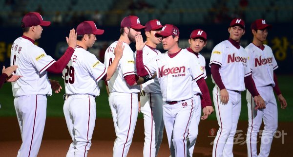 31일 서울 고척스카이돔에서 ‘2017 타이어뱅크 KBO 리그’ LG트윈스와 넥센히어로즈의 개막전 경기가 열렸다. 개막 행사에서 넥센 장정석 감독이 그라운드에 도열하며 선수들과 하이파이브 하고 있다.