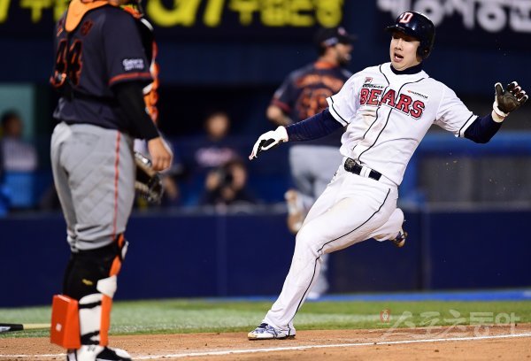 31일 잠실야구장에서 ‘2017 타이어뱅크 KBO리그’ 공식 개막전 두산베어스와 한화이글스의 경기가 열렸다. 3회말 1사 2,3루에서 두산 박건우가 민병헌의 희생플라이 상황에서 득점에 성공하고 있다.