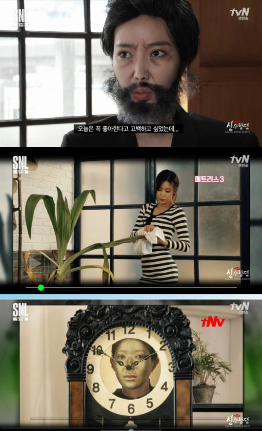 이가운데 그는 ‘교체배우 신수향뎐’ 코너에서 정상훈 PD의 교체배우로 투입돼 시청률 상승을 이끄는 배우로 열연했다. 그는 정상훈의 또 다른 드라마에도 교체투입돼 ‘로건’의 울버린을 연상케 하는 분장을 하기도 했다.