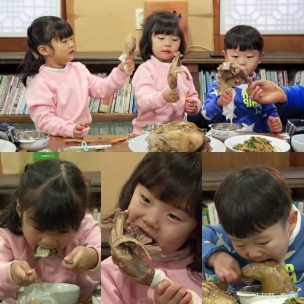 공개된 고사리 같은 손으로 닭다리를 잡고 있는 설아-수아-대박이는 한껏 들떠 보인다. 아이들의 얼굴보다 더 큰 닭다리가 시선을 강탈한다. 쌍 숟가락을 동원한 수아의 모습은 보는 이까지 배가 불러오는 듯하다. 닭다리의 살코기를 한 가득 물고 있는 설아, 누나들 못지 않게 입을 크게 벌린 채 닭다리를 먹고 있는 대박이까지. 세 남매의 폭풍먹방이 흐뭇함을 자아낸다.