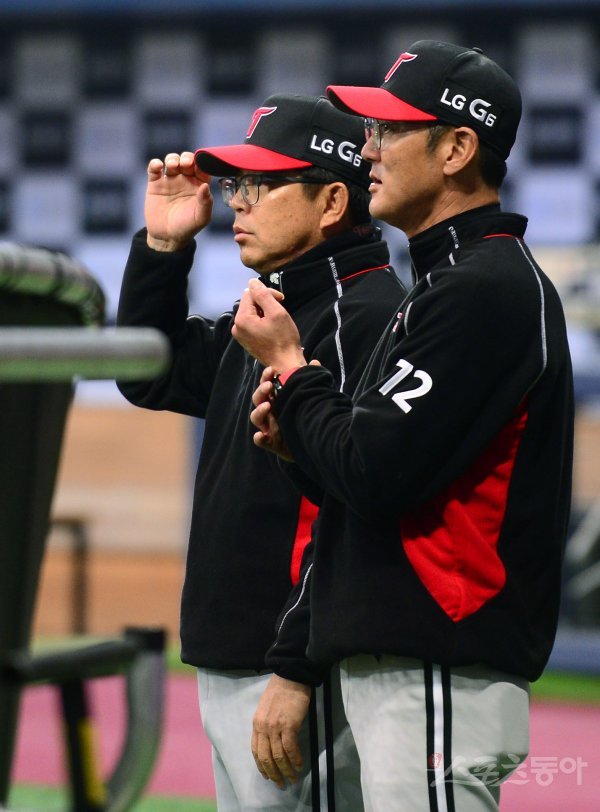 2일 서울 고척스카이돔에서 ‘2017 타이어뱅크 KBO리그’ 넥센 히어로즈와 LG 트윈스의 경기가 열린다. 경기전 LG 양상문 감독과 서용빈 코치가 이야기를 나누고 있다.