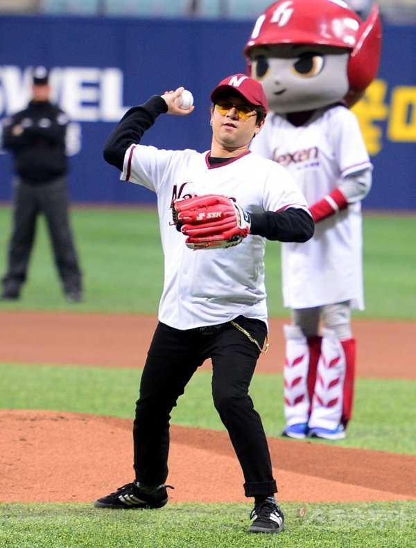 2일 서울 고척스카이돔에서 ‘2017 타이어뱅크 KBO리그’ 넥센 히어로즈와 LG 트윈스의 경기가 열렸다. 남성밴드 ‘크라잉넛’의 이상면이 시구를 던지고 있다.