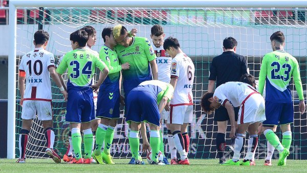 2일 전주종합경기장에서 ‘KEB하나은행 2017 K리그 클래식’ 4라운드 전북현대와 FC서울의 경기가 열렸다. 전반 전북현대 김진수(왼쪽 네 번째)가 프리킥 상황에서 김신욱(왼쪽 다섯 번째)와 귓속말을 나누고 있다.