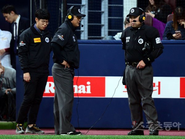 2일 서울 고척스카이돔에서 ‘2017 타이어뱅크 KBO리그’ 넥센 히어로즈와 LG 트윈스의 경기가 열렸다. 7회초 2사 만루에서 LG 손주인이 2타점 적시타 때 2루주자 양석환이 홈으로 파고들어 아웃이 선언됐다. 심판들이 LG의 요청으로 비디오판독을 실시하고 있다.