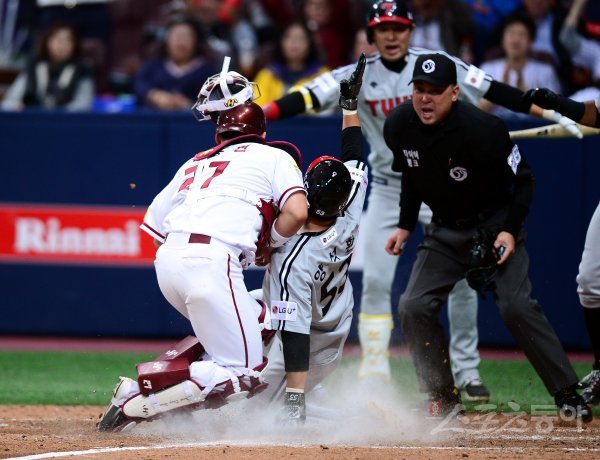 2일 서울 고척스카이돔에서 ‘2017 타이어뱅크 KBO리그’ 넥센 히어로즈와 LG 트윈스의 경기가 열렸다. 7회초 2사 만루에서 LG 손주인이 2타점 적시타 때 2루주자 양석환이 홈으로 파고들었으나 아웃되고 있다. 하지만 비디오판독결과 세이프로 판정.