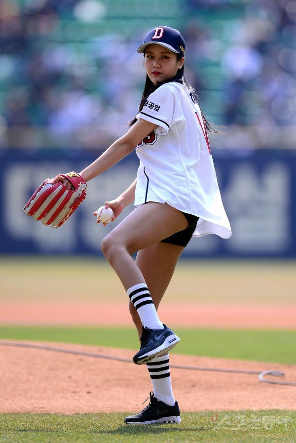 2일 서울 잠실야구장에서 ‘2017 타이어뱅크 KBO 리그’ 한화이글스와 두산베어스가 열렸다. 경기 전 걸그룹 ‘AOA’ 혜정이 시구를 하고 있다.