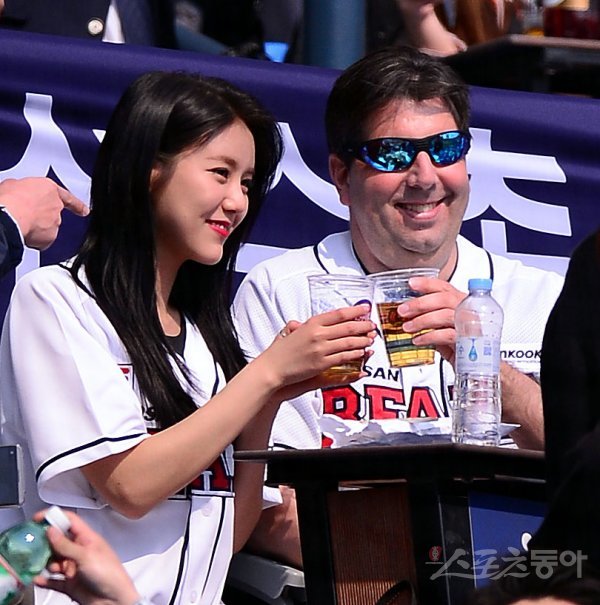2일 서울 잠실야구장에서 ‘2017 타이어뱅크 KBO 리그’ 한화이글스와 두산베어스가 열렸다. 경기 전 걸그룹 ‘AOA’ 혜정이 리퍼트 전 주한미국 대사와 맥주을 건배하고 있다.