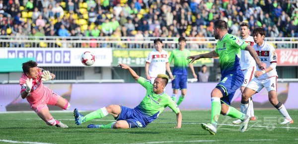 2일 전주종합경기장에서 ‘KEB하나은행 2017 K리그 클래식’ 4라운드 전북현대와 FC서울의 경기가 열렸다. 후반 전북현대 김신욱이 슈팅을 시도했으나 FC서울 골키퍼 유현에게 막히고 있다.