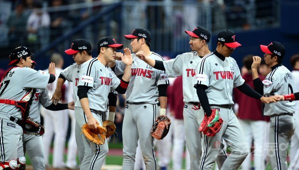 2일 서울 고척스카이돔에서 ‘2017 타이어뱅크 KBO리그’ 넥센 히어로즈와 LG 트윈스의 경기가 열렸다. LG가 넥센에 9-2로 승리하며 스윕승을 거둔 뒤 선수들이 그라운드에서 기쁨을 나누고 있다.