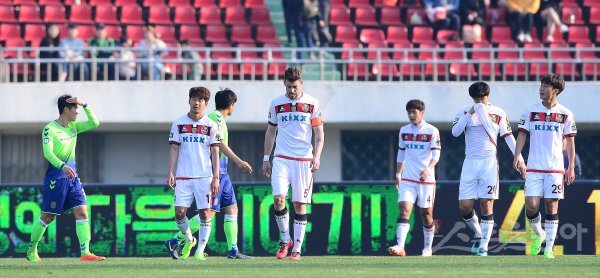 2일 전주종합경기장에서 열린 ‘KEB하나은행 2017 K리그 클래식’ 4라운드 전북현대와 FC서울의 경기에서 전북현대가 1-0으로 승리했다. 경기 후 FC서울 선수들이 고개를 떨구고 있다.