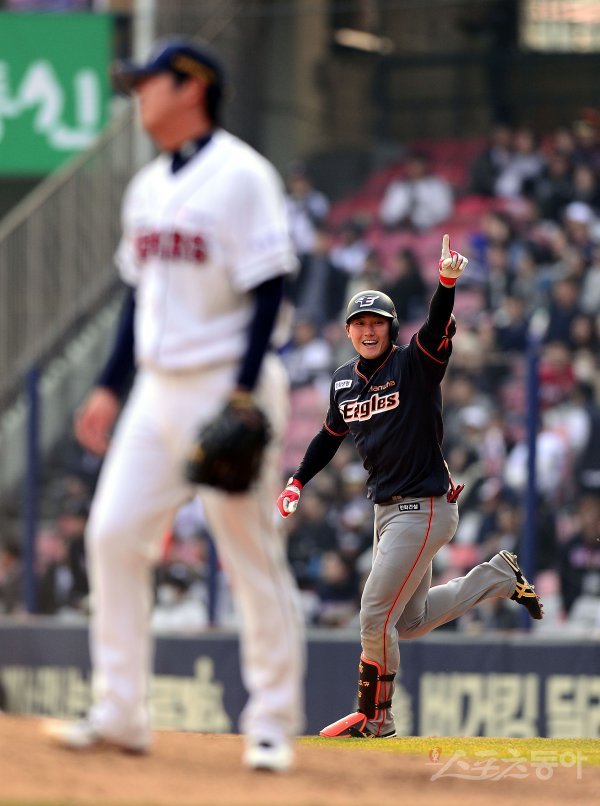 2일 서울 잠실야구장에서 ‘2017 타이어뱅크 KBO 리그’ 한화이글스와 두산베어스가 열렸다. 연장 11회초 1사 한화 신성현이 두산 김성배를 상대로 역전 좌월 솔로 홈런을 날리고 그라운드를 돌며 환호하고 있다.