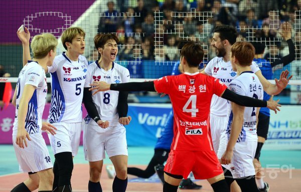 3일 인천 계양체육관에서 ‘2016-2017 NH농협 V리그’ 인천 대한항공과 천안 현대캐피탈의 챔피언결정전 5차전 경기가 열렸다. 대한항공 김학민(8)이 공격을 성공시킨 뒤 동료들과 기쁨을 나누고 있다.