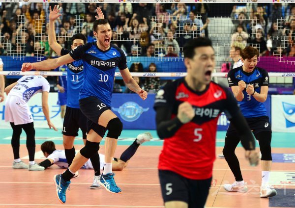 3일 인천 계양체육관에서 ‘2016-2017 NH농협 V리그’ 인천 대한항공과 천안 현대캐피탈의 챔피언결정전 5차전 경기가 열렸다. 현대캐피탈 대니(10)가 가로막기를 성공시킨 뒤 환호하고 있다.